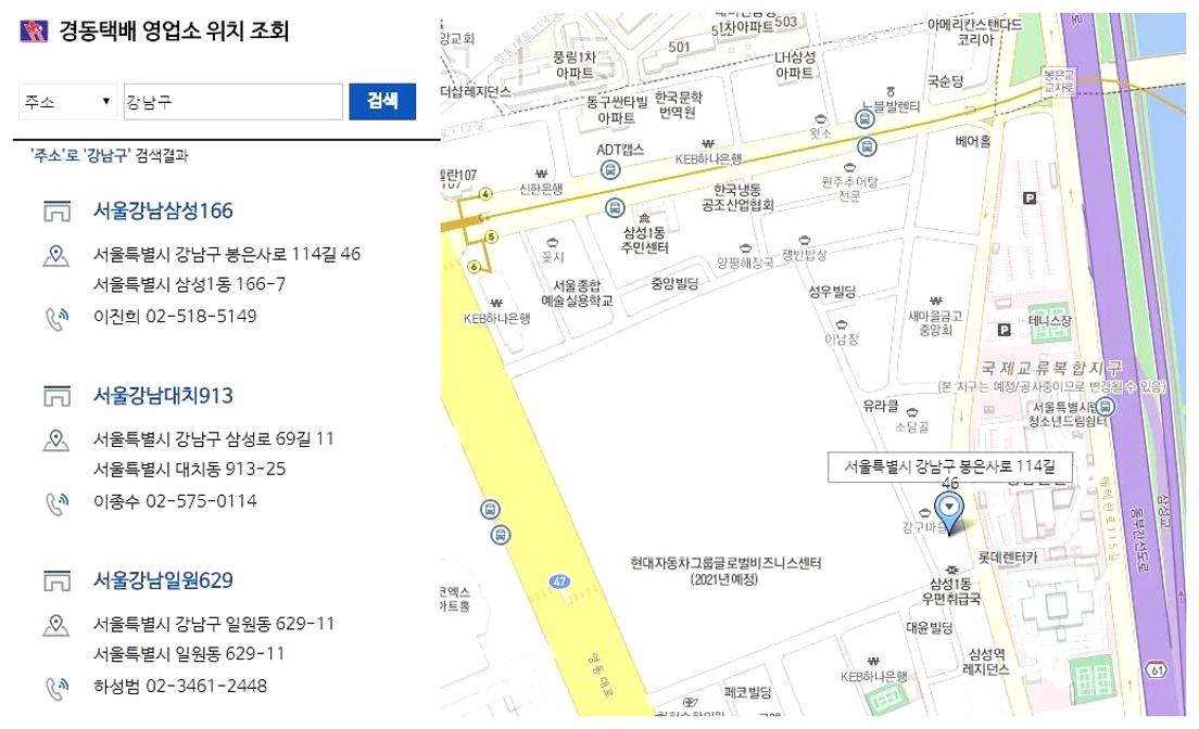 지역 이름을 검색하면 경동화물 지점조회 결과가 보여집니다. 전국적으로 많은 지점을 운영하고 있기 때문에, 원하는 지점을 쉽게 찾아갈 수 있습니다.